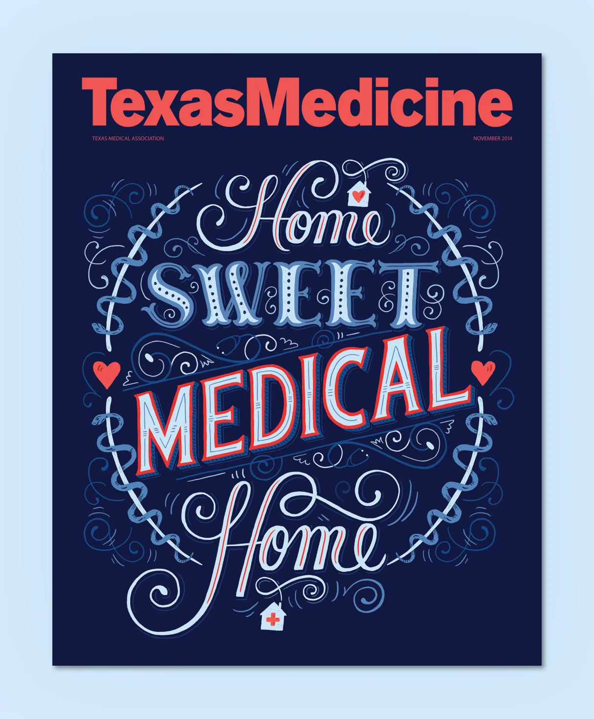 I was happy to work on the cover for Texas Medicine. The cover story is about bringing medical care home so I went with a home-y theme bringing medical motifs throughout the decorative flourishes.